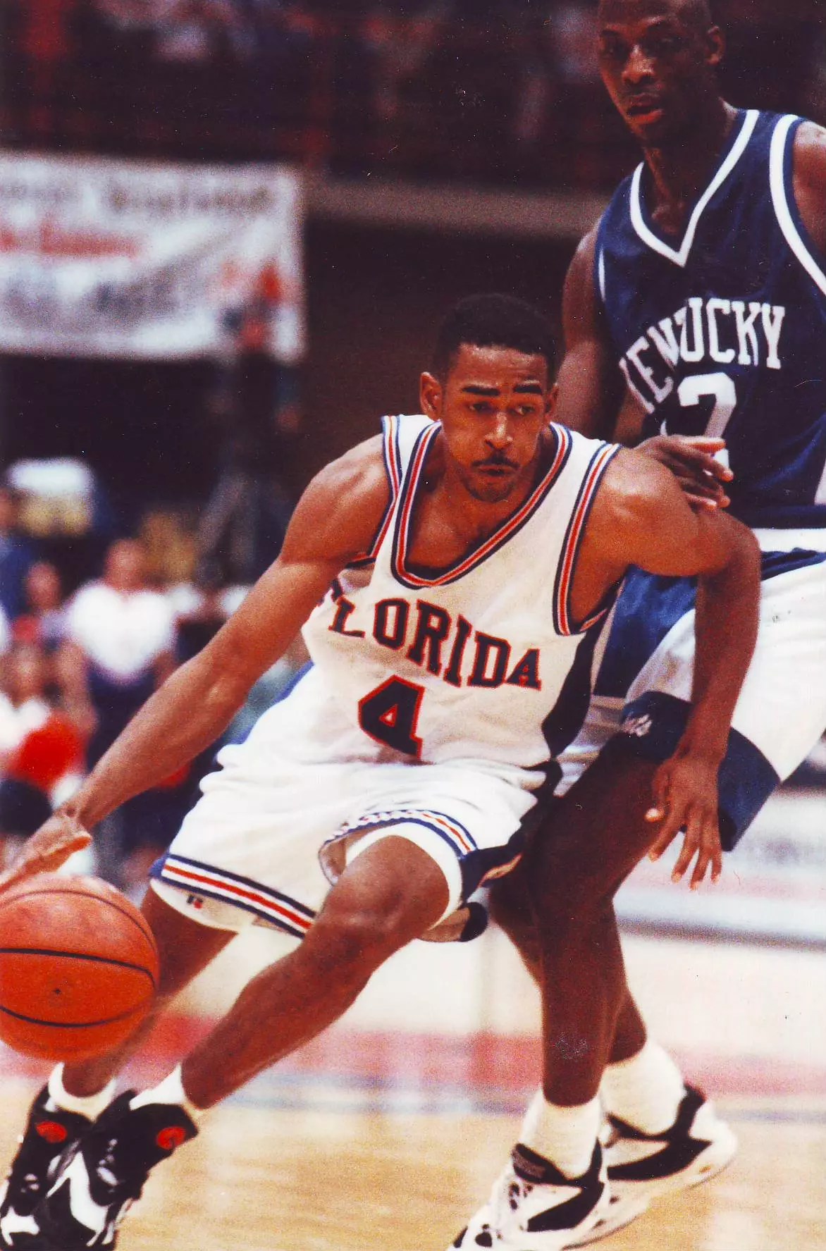Florida University describes him as the leader-shooting guard of the 1993–94 team and notes that he was the first signee of the Lon Kruger era. As a senior, he started all 37 games, averaged 14.8 points, 4.9 rebounds, shot 45.8% from the field and 43.2% from three, while setting a school record with 89 made threes that season. He finished his career as the program’s all-time leader in three-point field goals at the time and still ranks among the school’s top all-time scorers.